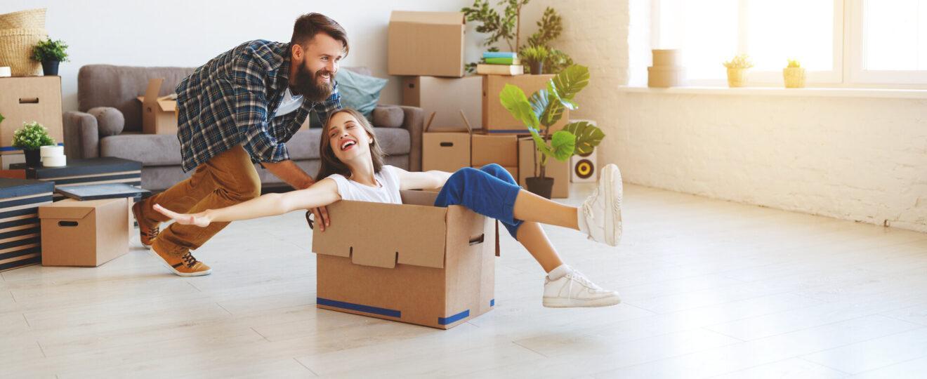 Ein glückliches junges Ehepaar zieht in eine neue Wohnung